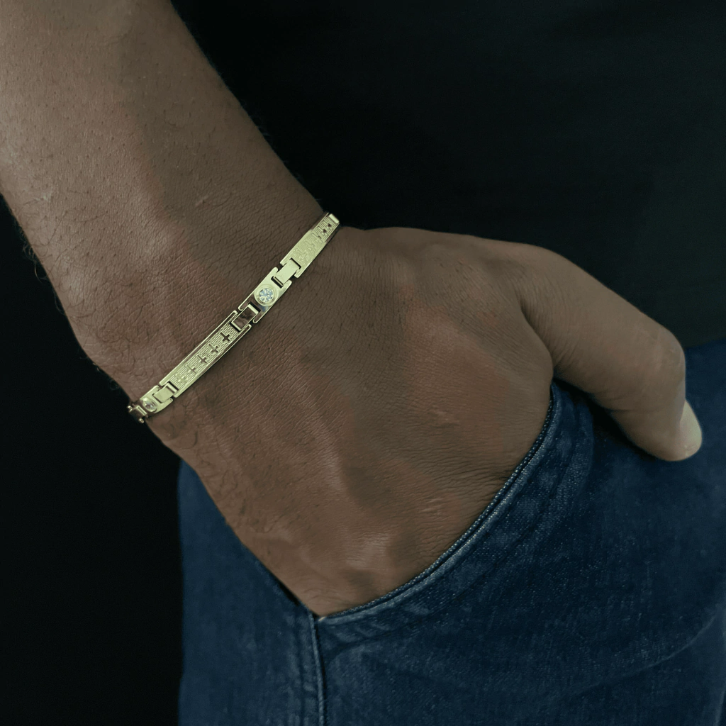 Especificações: Bracelete de moeda antiga cruz c/ pedra branca 5mm, 5 gramas com fecho central com 750 no fecho, trazendo mais conforto e segurança ao usá-lo.